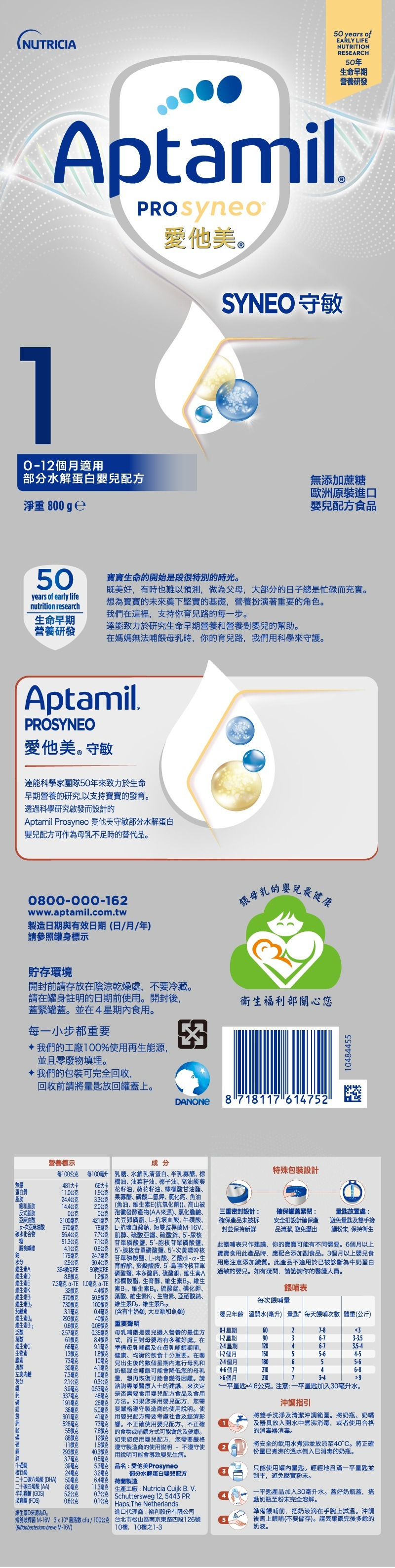 Aptamil 愛他美 Prosyneo 守敏部份水解蛋白嬰兒配方, 800g, 0-12個月
